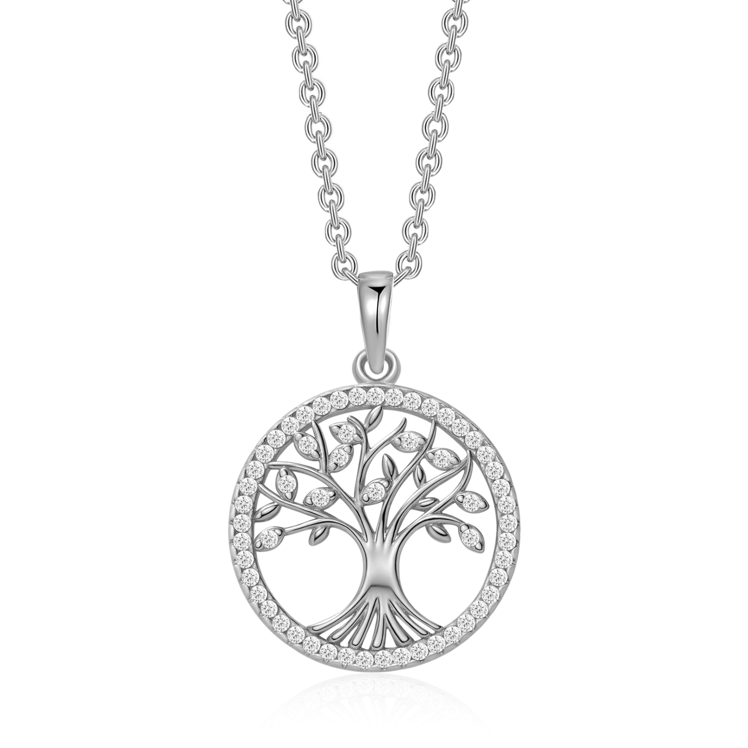 Sølv halskæde rhodineret livets træ i cirkel med syntetiske cubic zirconia.
