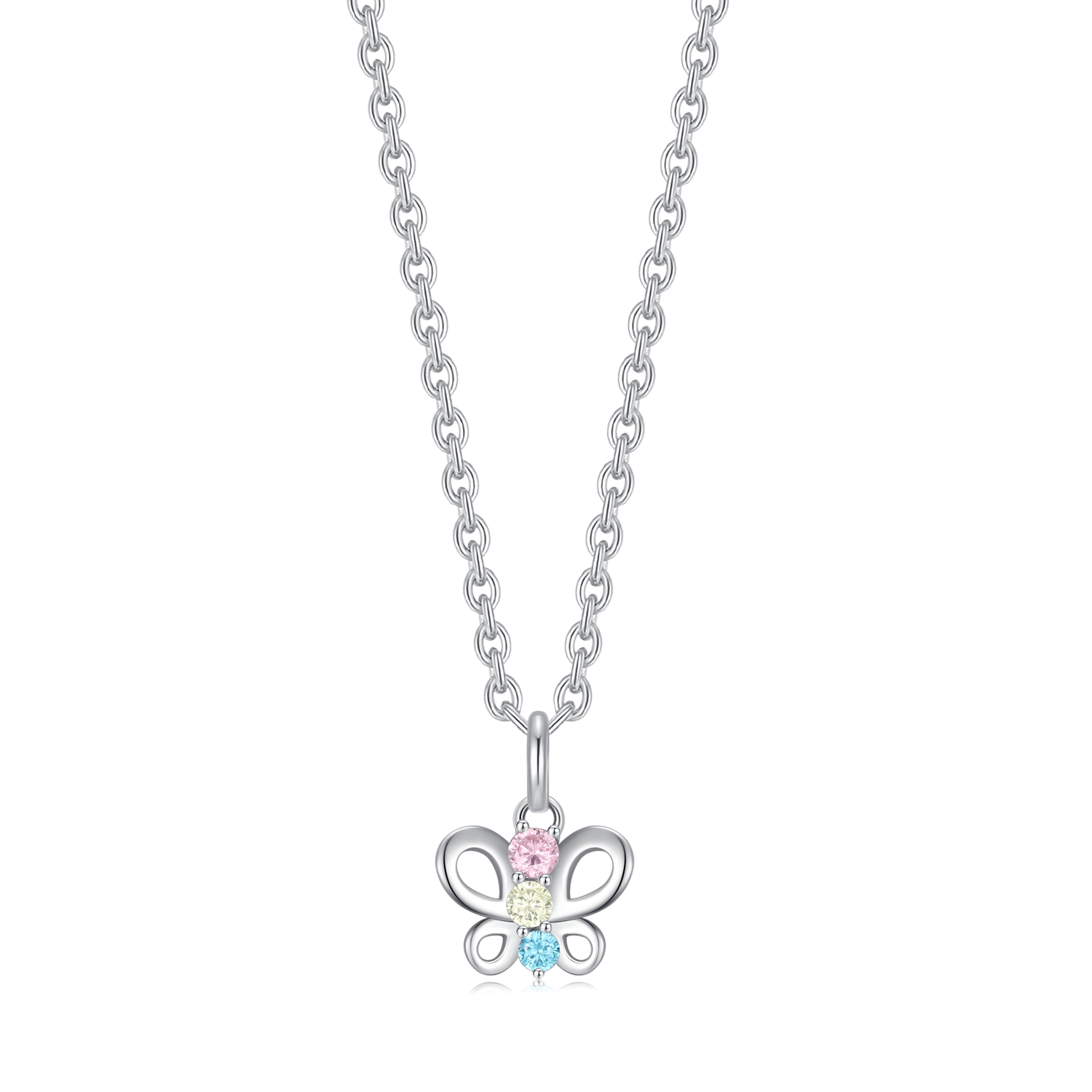 Sølv halskæde rhodineret sommerfulg med syntetiske cubic zirconia i farver på kroppen.