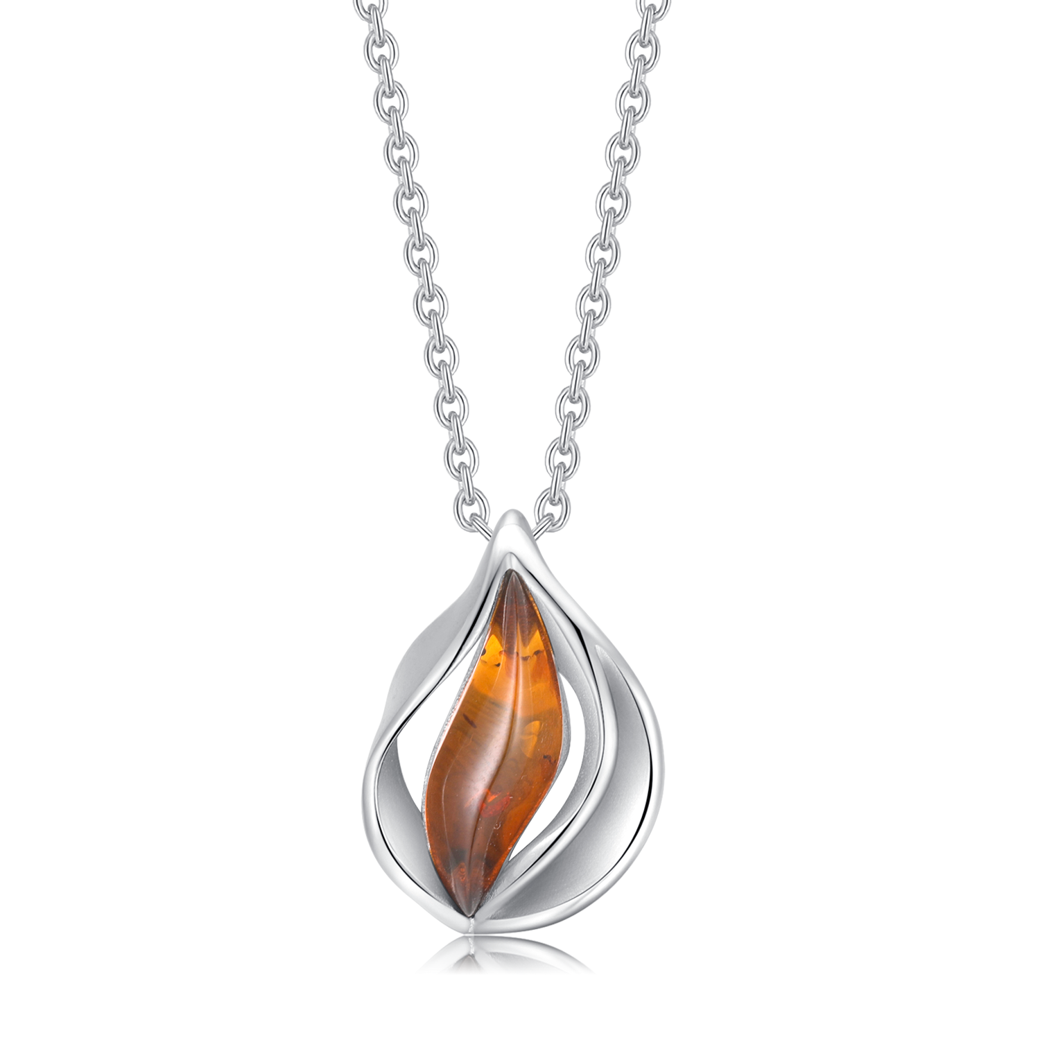 Sølv halskæde rhodineret blad med rav i midten.