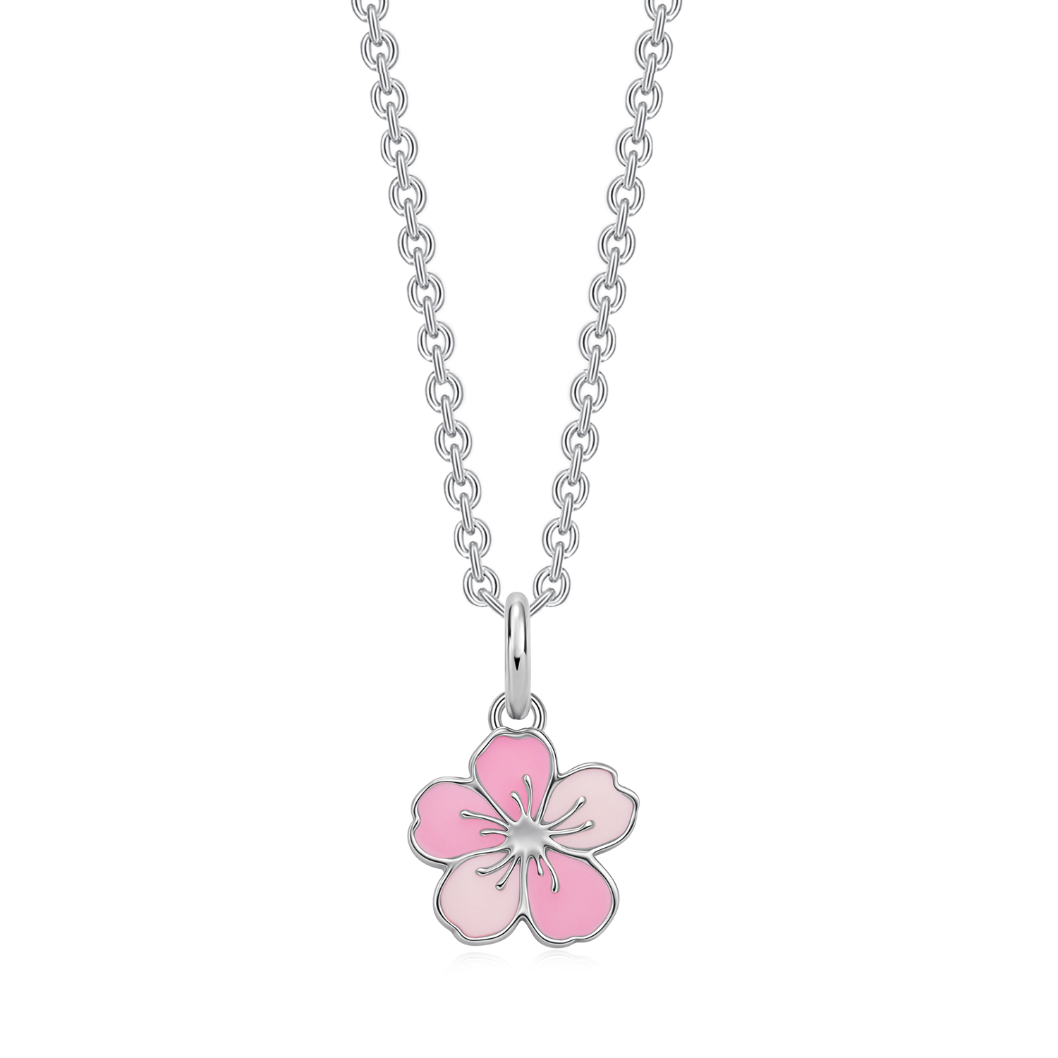 Sølv halskæde rhodineret blomst i lyserød og pink blyfri emalje.