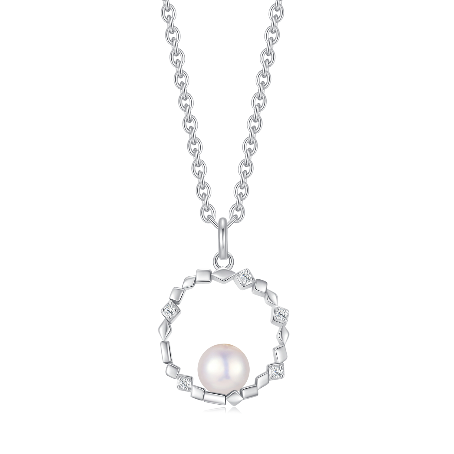 Sølv halskæde rhodineret zigzag cirkel med syntetiske cubic zirconia og ferskvandsperle.