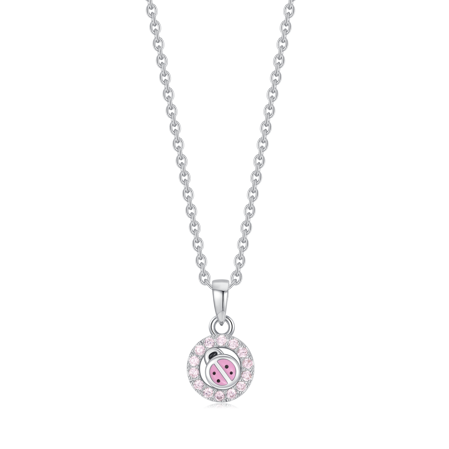Sølv halskæde rhodineret cirkel med mariehøne i lyserød blyfri emalje og syntetiske cubic zirconia.