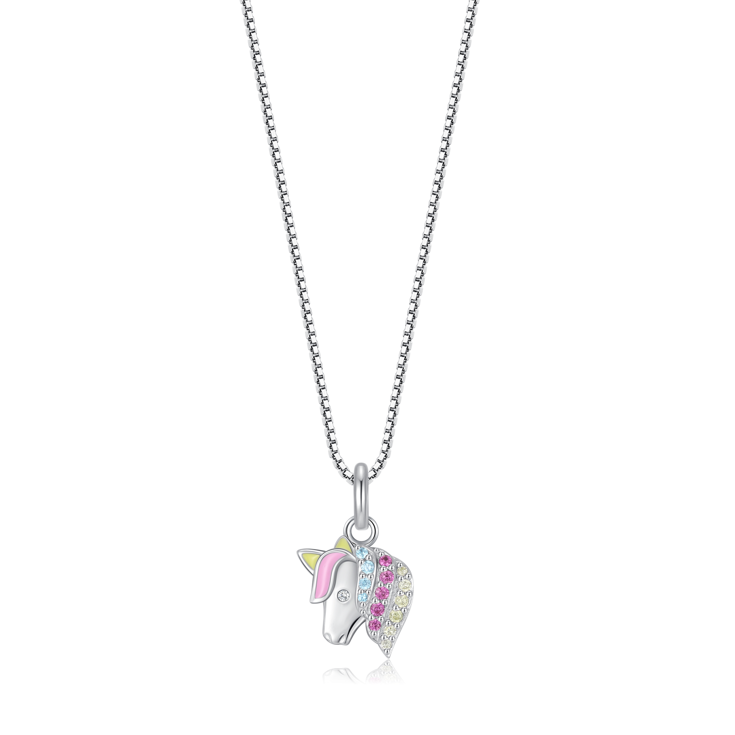 Sølv halskæde rhodineret enhjørning hoved med blyfri emalje og farver syntetiske cubic zirconia.