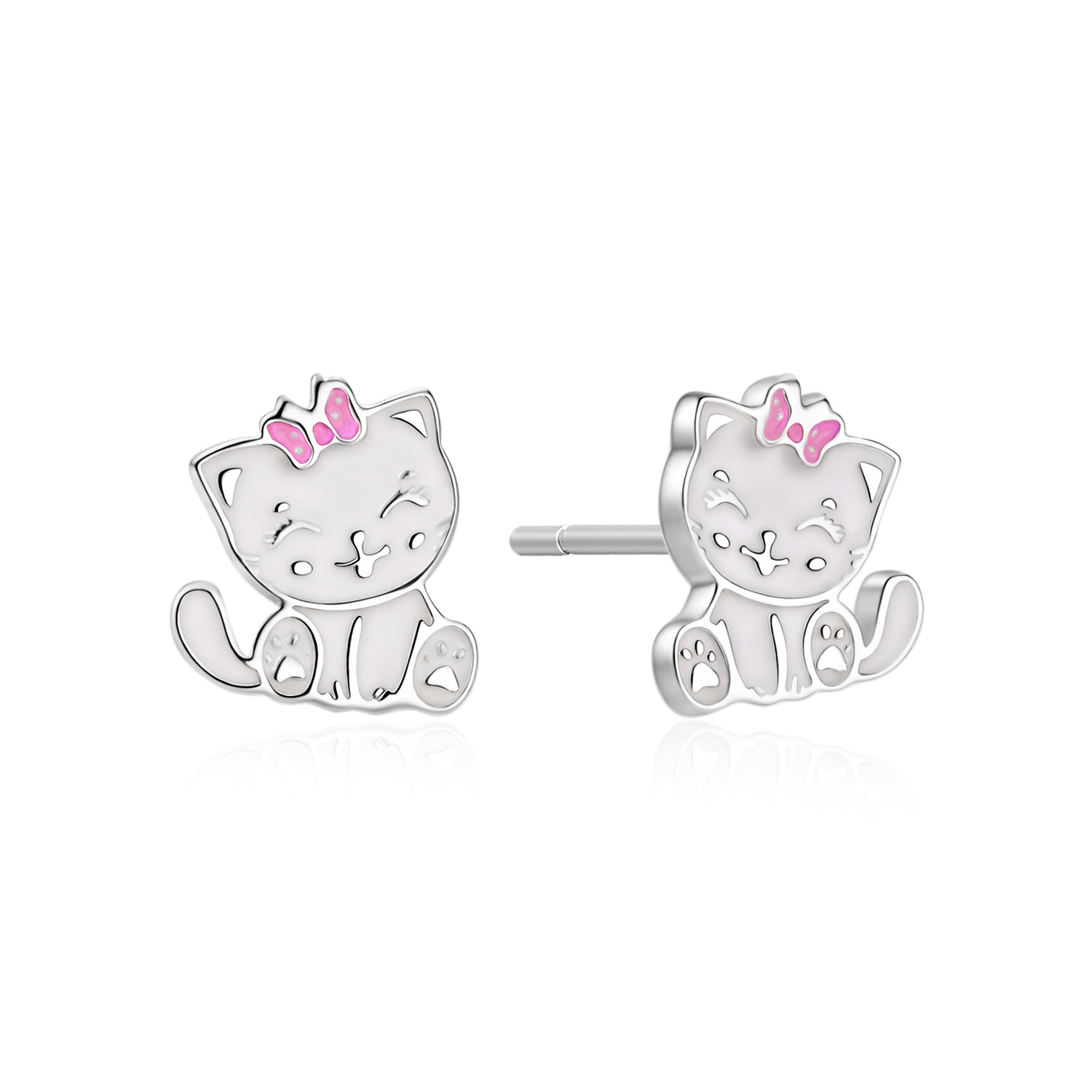 Sølv ørestikker kat i hvid med ryserød sløjfe blyfri emalje.