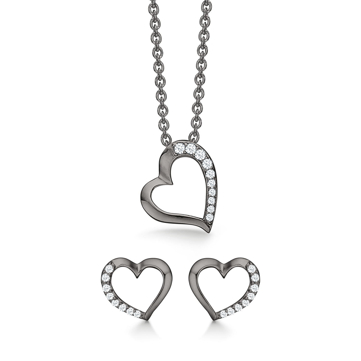 Sølv smykkesæt sort rhodineret skæv hjerte med syntetisk cubic zirconia i den ene kant.