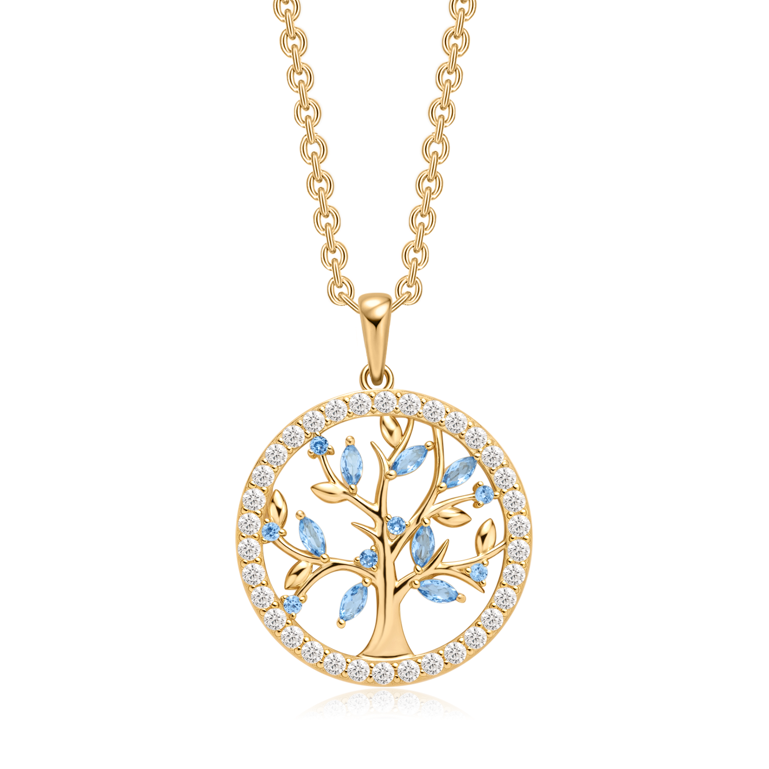 Sølvforgyldt halskæde livet træ i cirkel med blå syntetiske cubic zirconia.