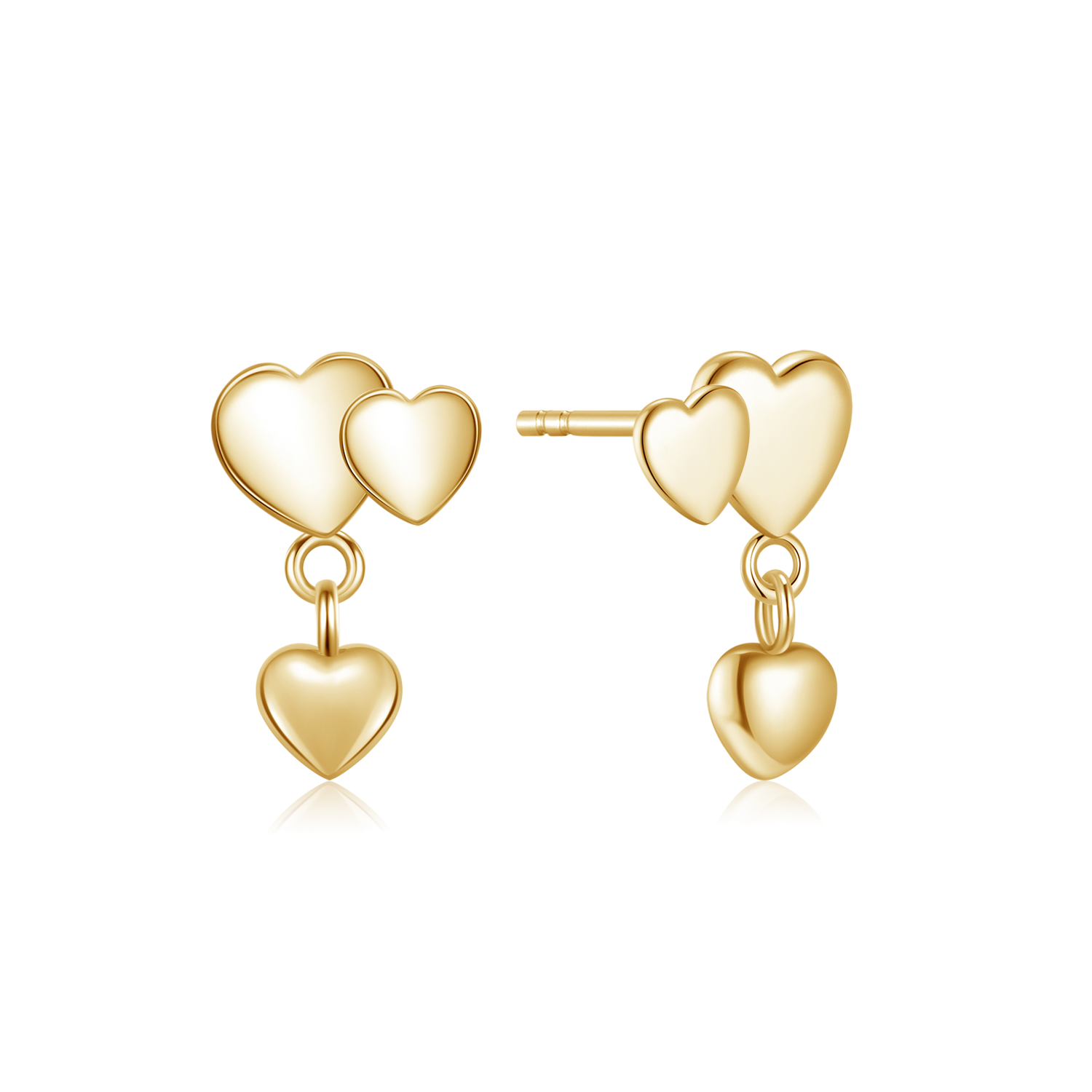 Sølvforgyldt ørestikker 3 forkellige hjerter, hvor den mindste hænger ned i bunden.
