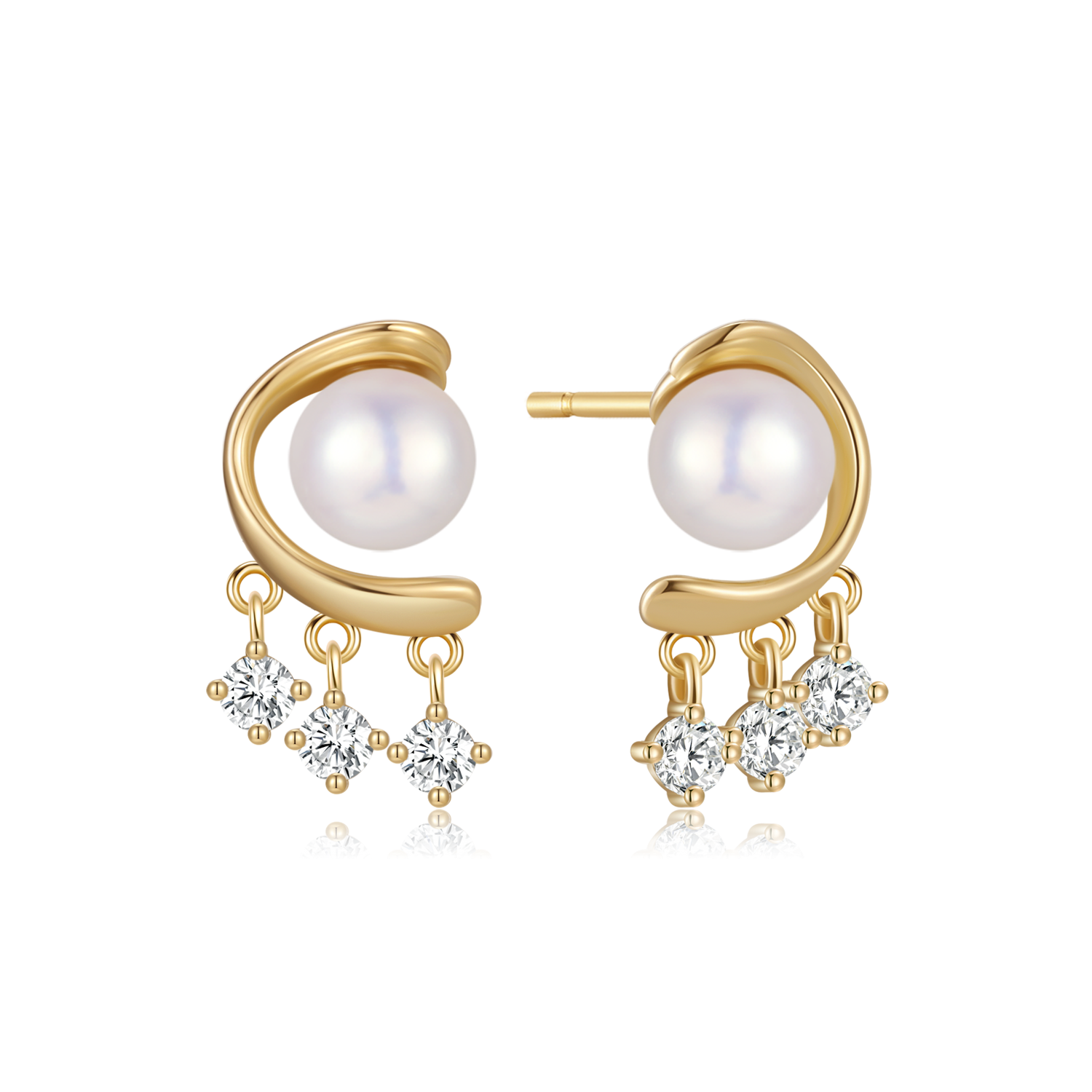 Sølvforgyldt ørestikker halv bue med ferskvandsperle i midten og 3 syntetiske cubic zirconia som hænger.